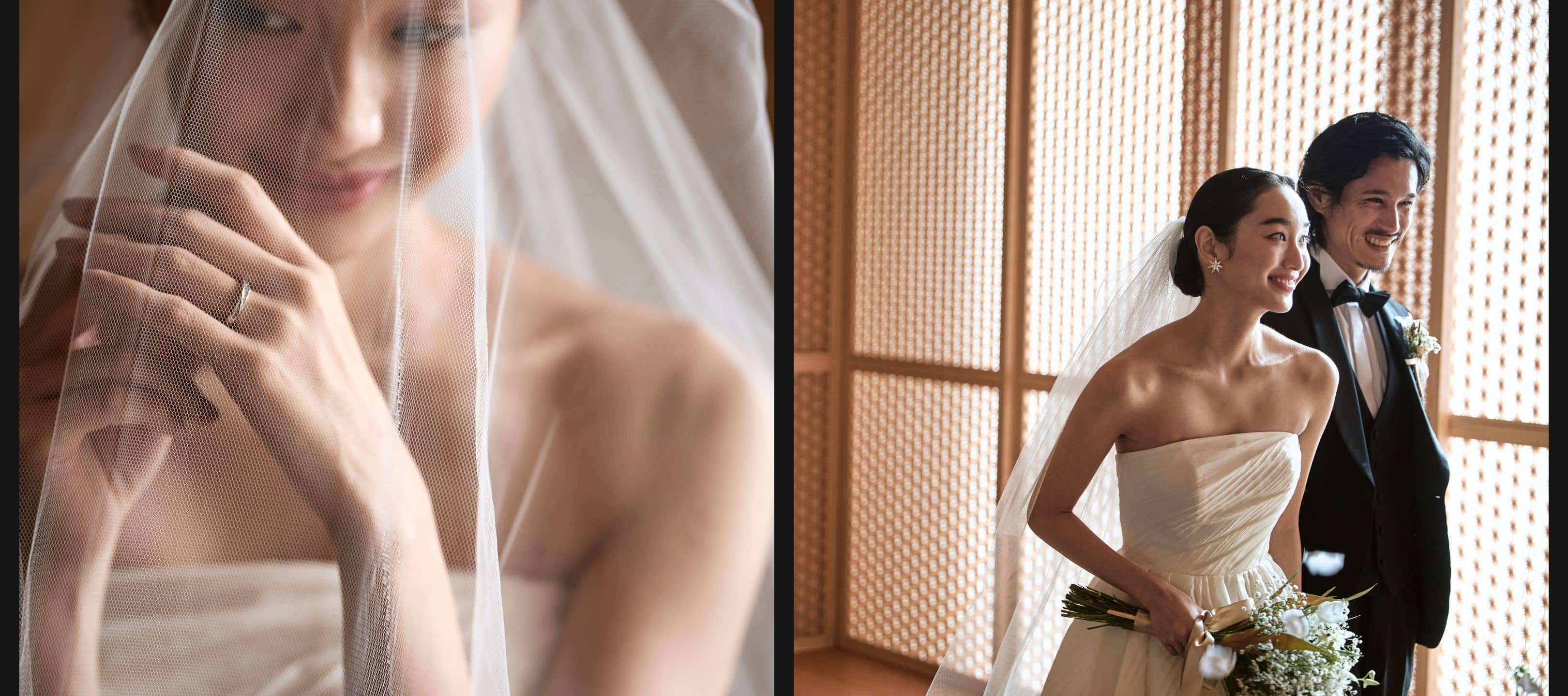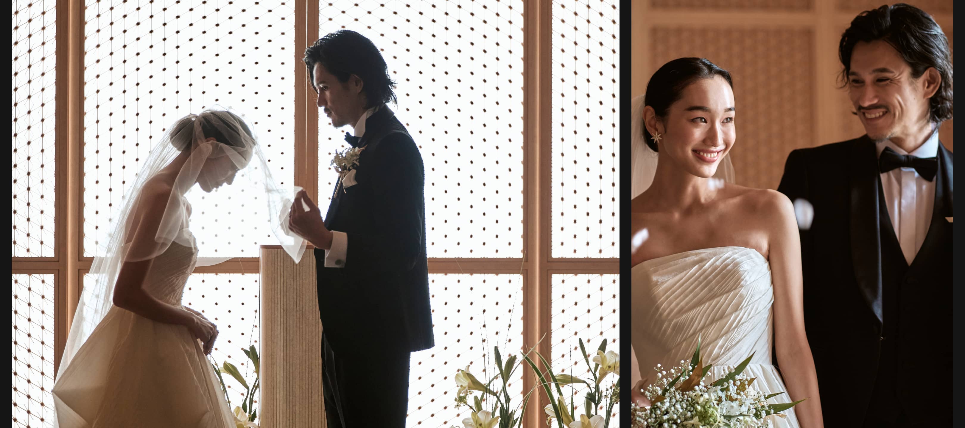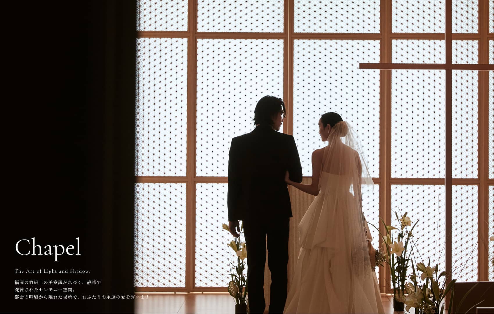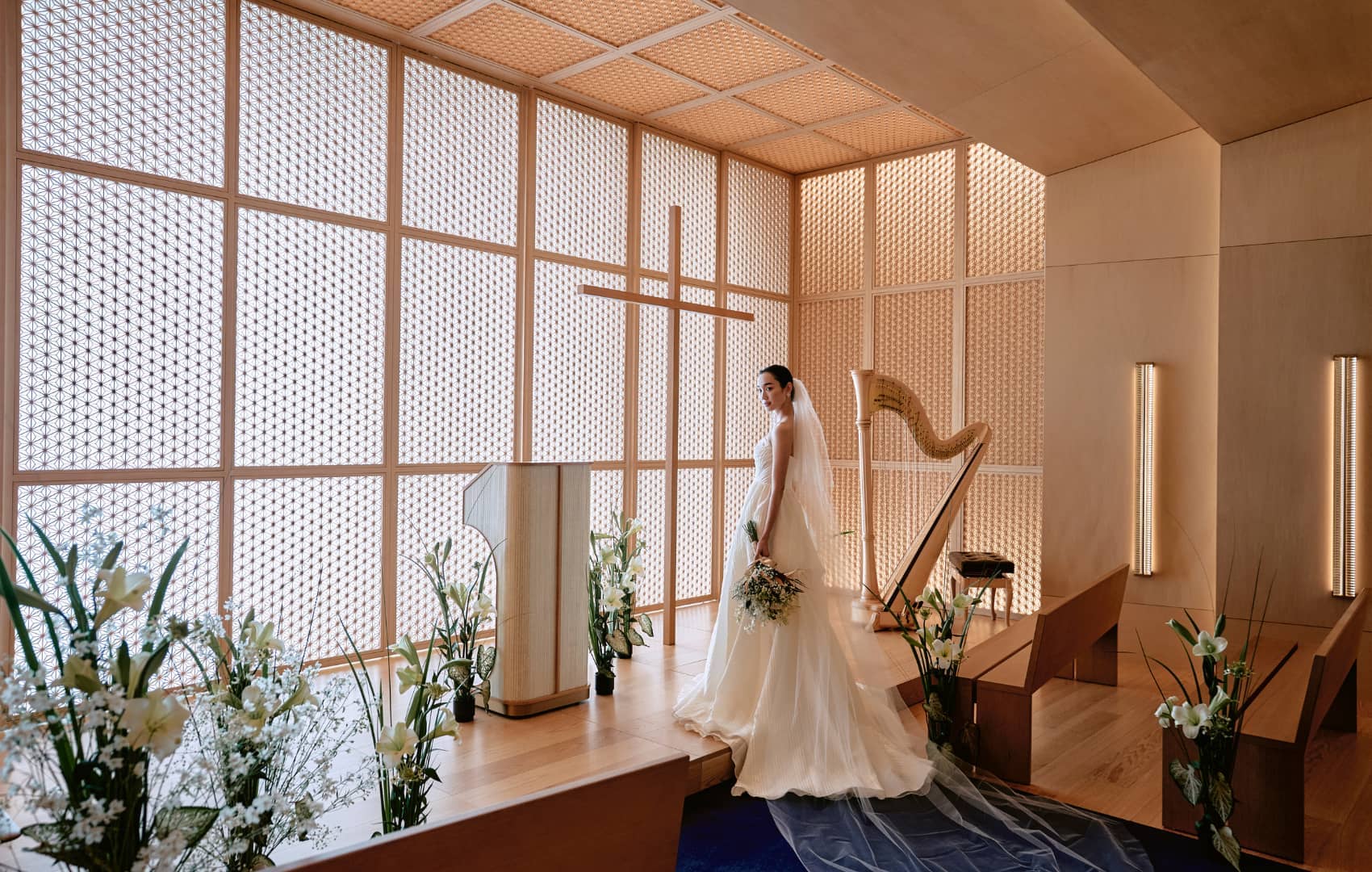 伝統的な意匠をモダンに昇華させた空間は、光と影のグラデーションを創出。繊細な光がおふたりの誓いの瞬間を優しく包み込みます。