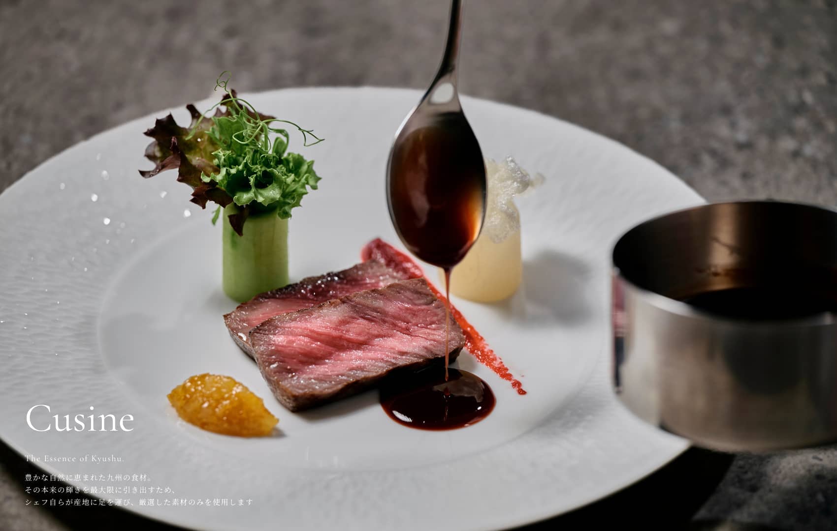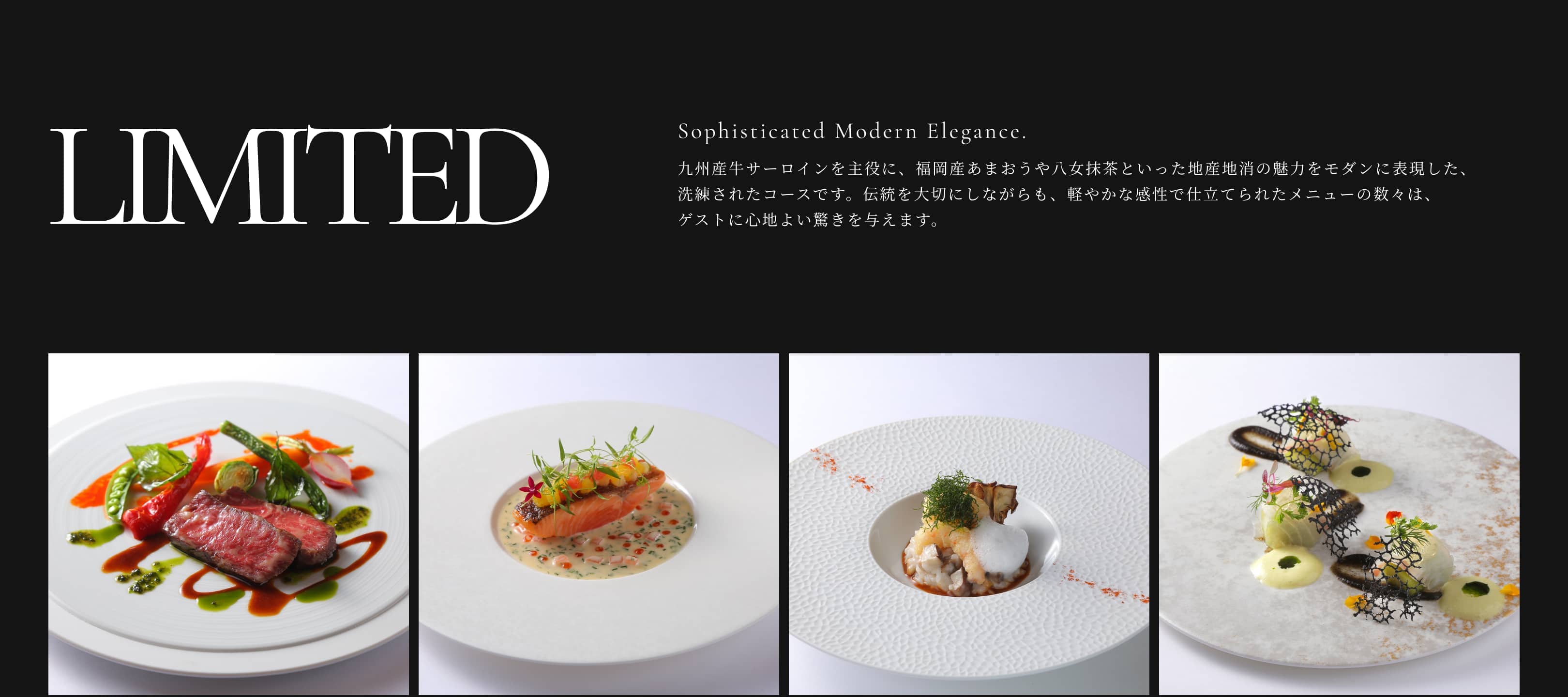 九州産牛サーロインを主役に、福岡産あまおうや八女抹茶といった地産地消の魅力をモダンに表現した、洗練されたコースです。伝統を大切にしながらも、軽やかな感性で仕立てられたメニューの数々は、ゲストに心地よい驚きを与えます。