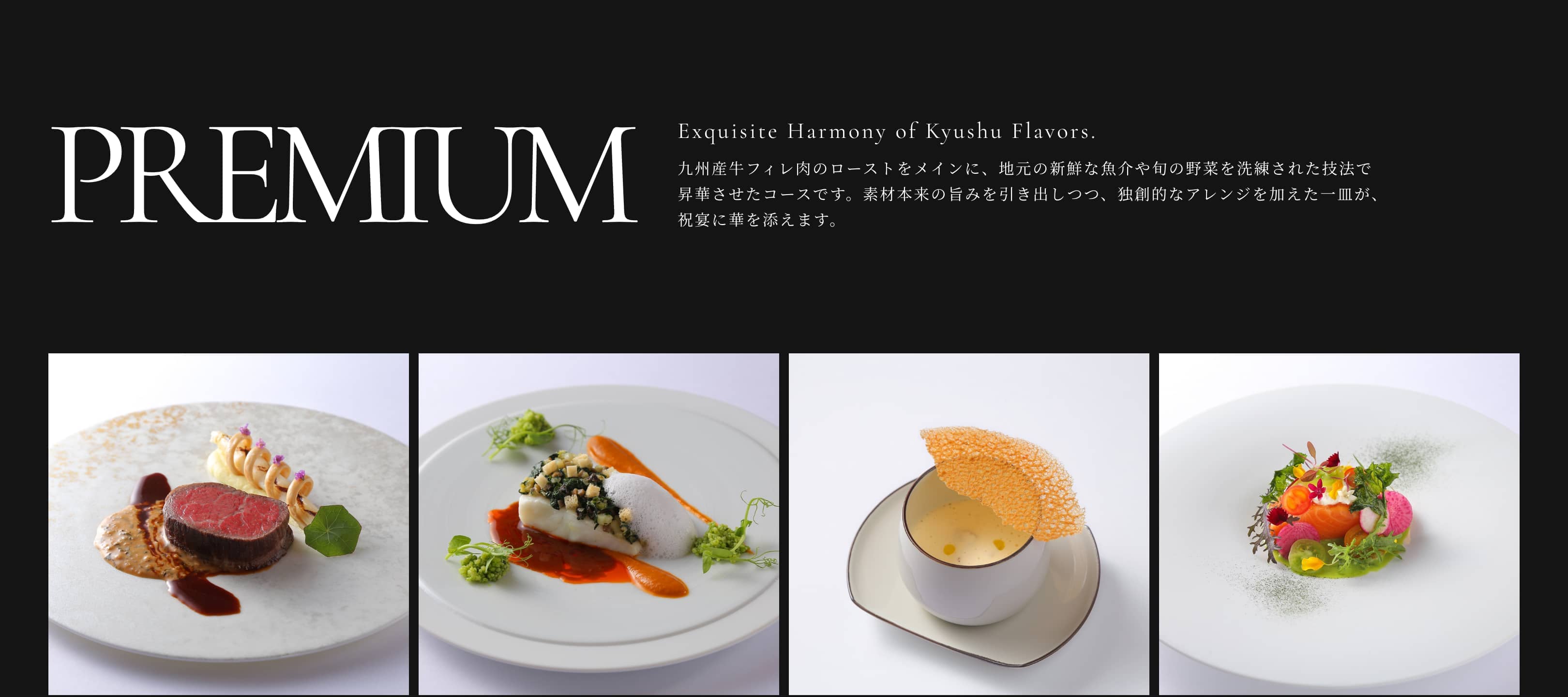 九州産牛フィレ肉のローストをメインに、地元の新鮮な魚介や旬の野菜を洗練された技法で昇華させたコースです。素材本来の旨みを引き出しつつ、独創的なアレンジを加えた一皿が、祝宴に華を添えます。
