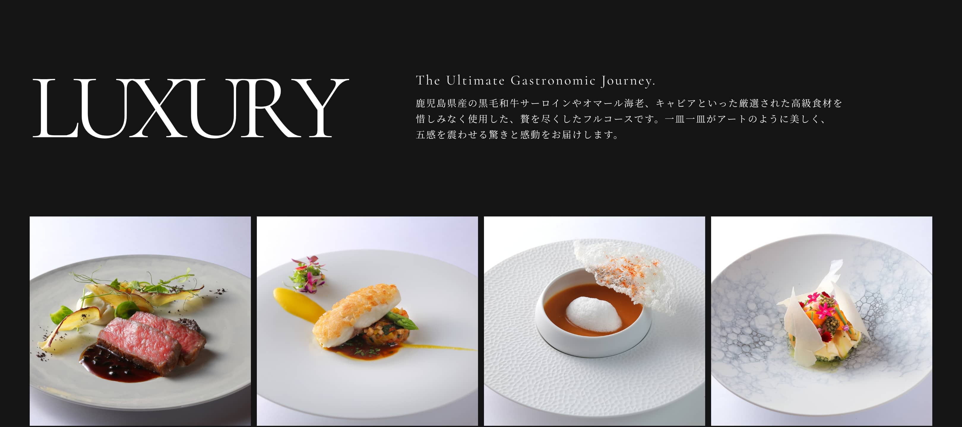 鹿児島県産の黒毛和牛サーロインやオマール海老、キャビアといった厳選された高級食材を惜しみなく使用した、贅を尽くしたフルコースです。一皿一皿がアートのように美しく、五感を震わせる驚きと感動をお届けします。